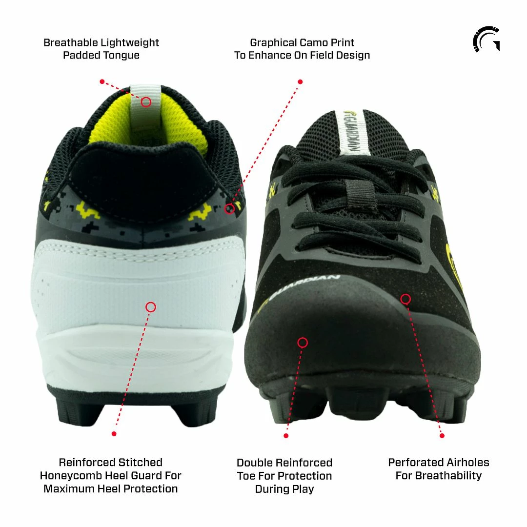 - FASHION BLENDED WITH PERFORMANCE:Â Our blaze cleats feature Guardian Baseballs’ branding on the tongue and side of the shoes. Featuring our Patented V-Cleat configuration, low-top design for extreme comfort and durability. Your girls or boys will enjoy quicker leadoff, better support for speed, cutting, and stopping.AU4