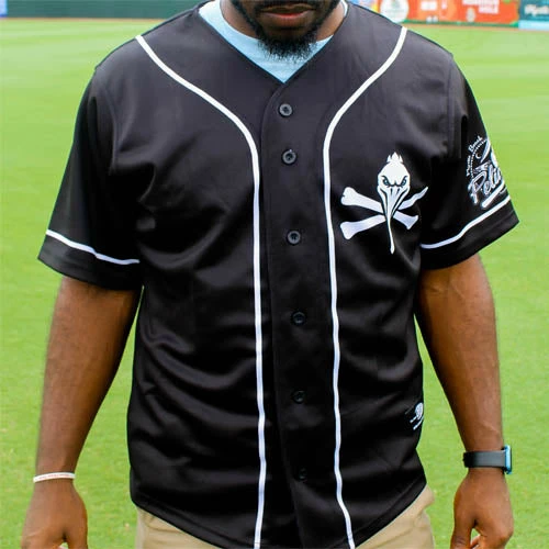 Myrtle Beach Pelicans OT Sports Black Pirate Sublimated Replica Full Button Jersey with Pirate Logo on Left Chest. Bird on Bat Logo Sublimated in White on Left Sleeve.