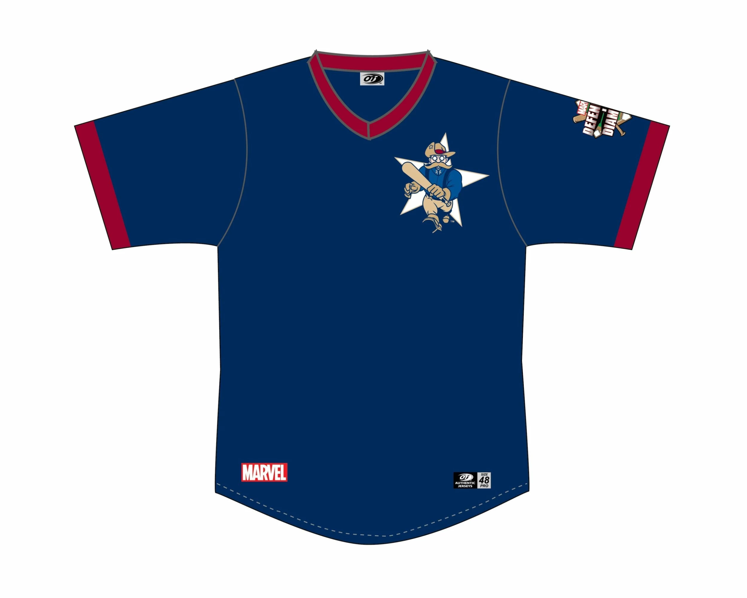 The Frisco RoughRiders are part of Minor League Baseball’s Official Marvel’s Defenders of the Diamond program and now you can show your love for two of America’s great passions- baseball and Marvel Super Heroes. This jersey features a unique logo designed by a Marvel animator to give you a new Marvel-inspired Frisco RoughRiders logo to wear proudly!