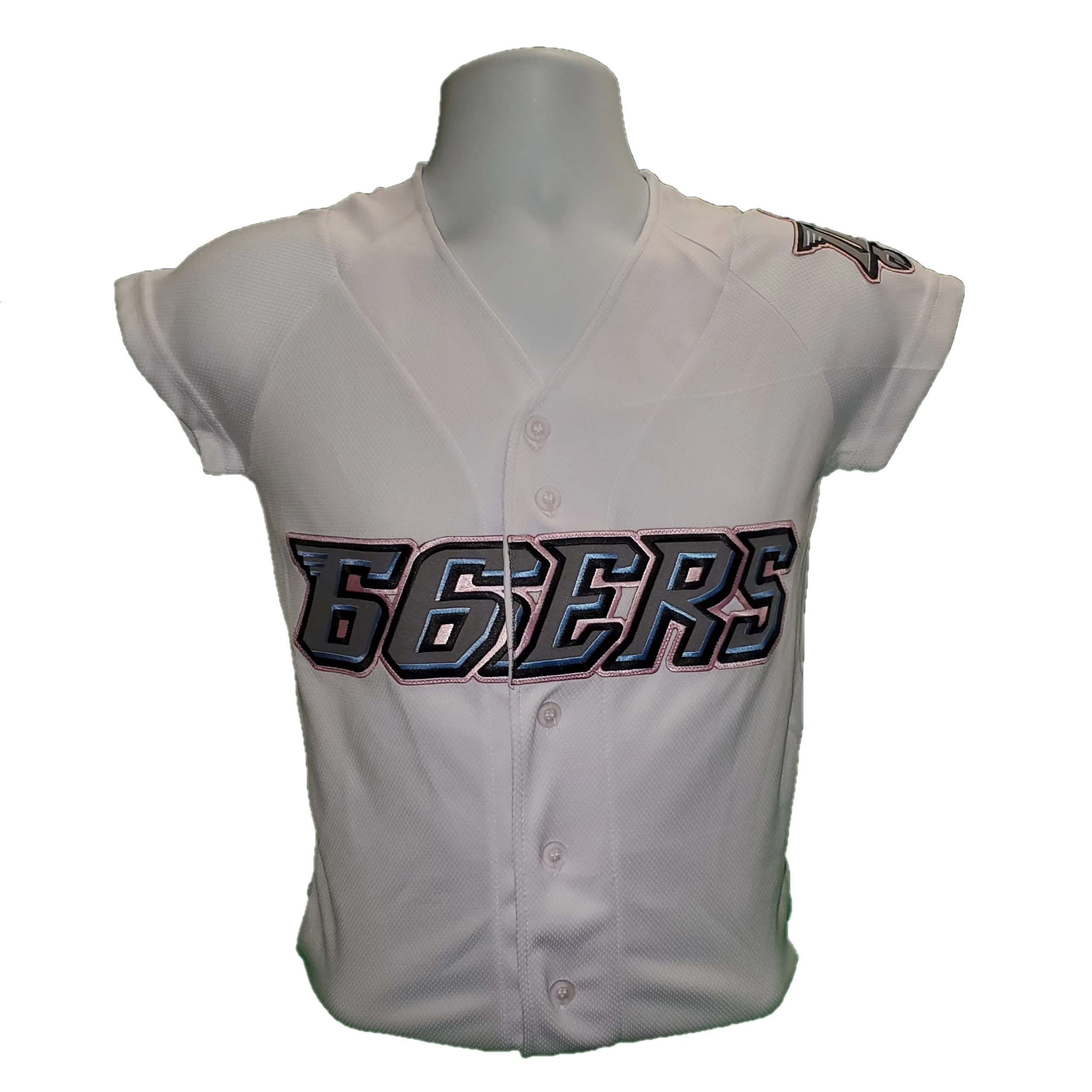 Dawning white with a hue of pink this 66ers alternate women’s jersey brings out the best in baseball. The baseball players are great and fun to watch but behind them is a strong woman who supported them and helped them throughout the years. This jersey is for all those women. Make sure to get one for yourself today!