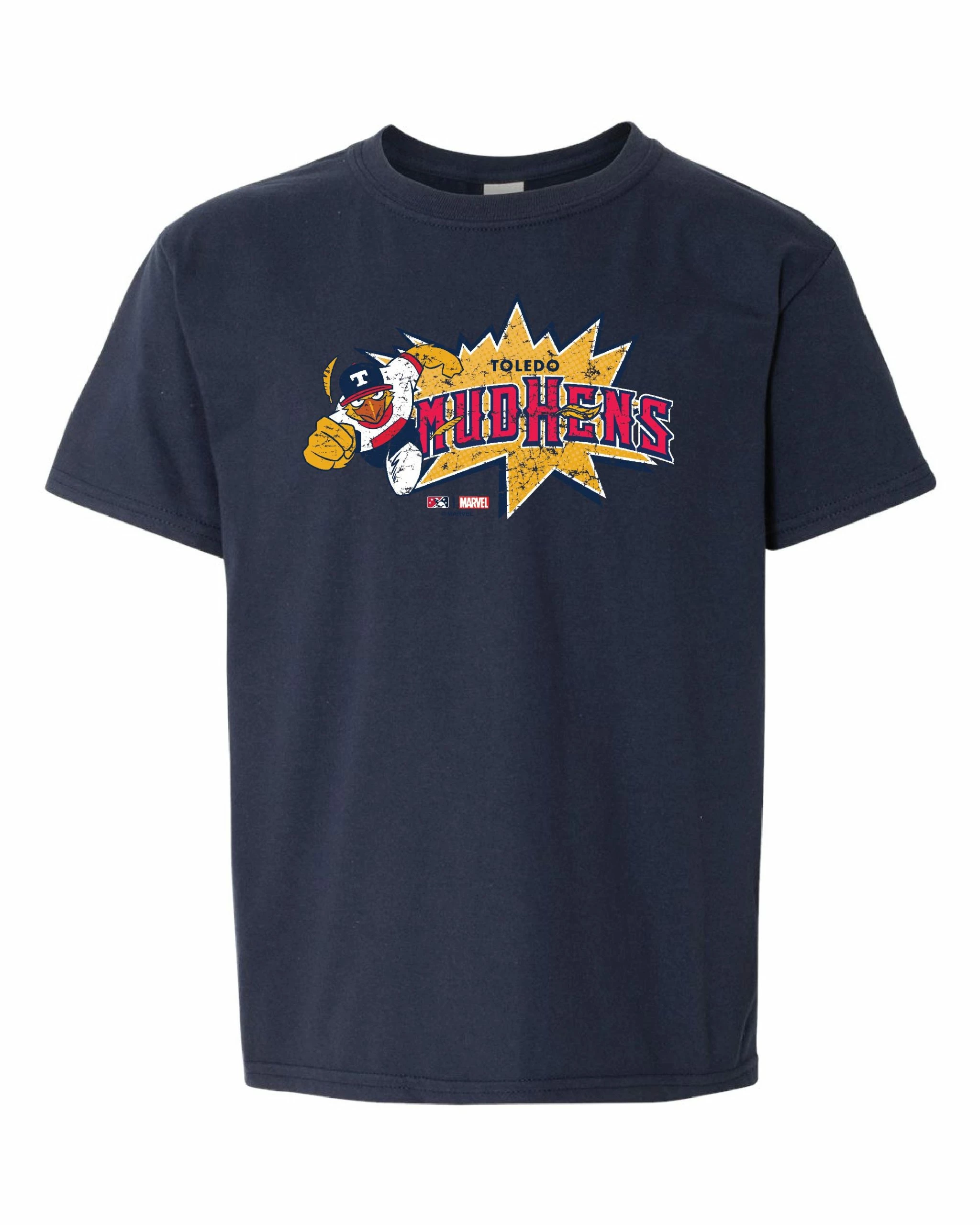 The Toledo Mud Hens are part of Minor League Baseball’s official Marvel’s Defenders of the Diamond program and now you can show your love for two of America’s great passions – baseball and Marvel Super Heroes. This Mud Hens Youth Burst T-shirt features a unique logo designed by a Marvel animator to give you a new Marvel-inspired Mud Hens logo to wear proudly!