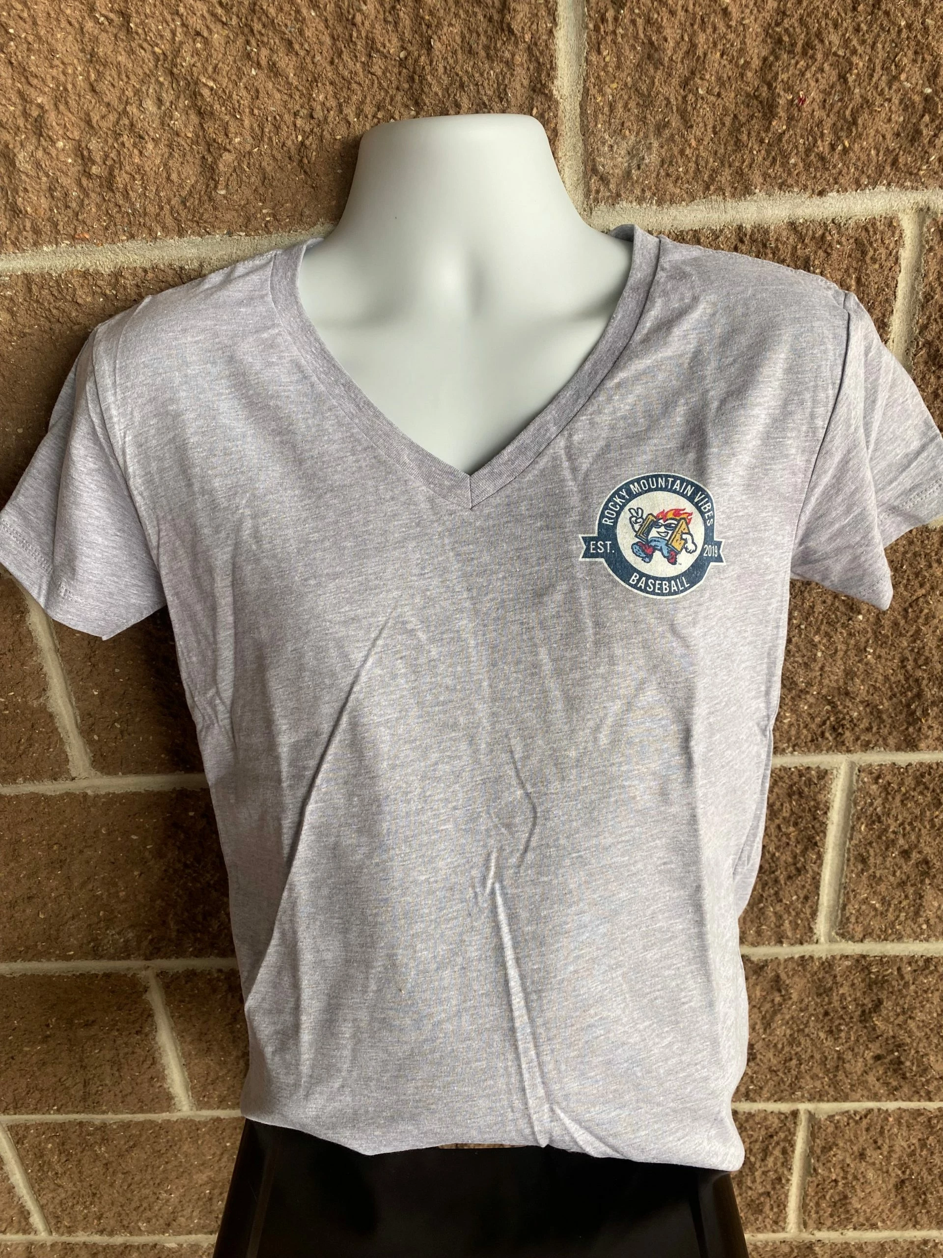 Women’s gray V-neck featuring the Rocky Mountain Vibes Est. 2019 logo.